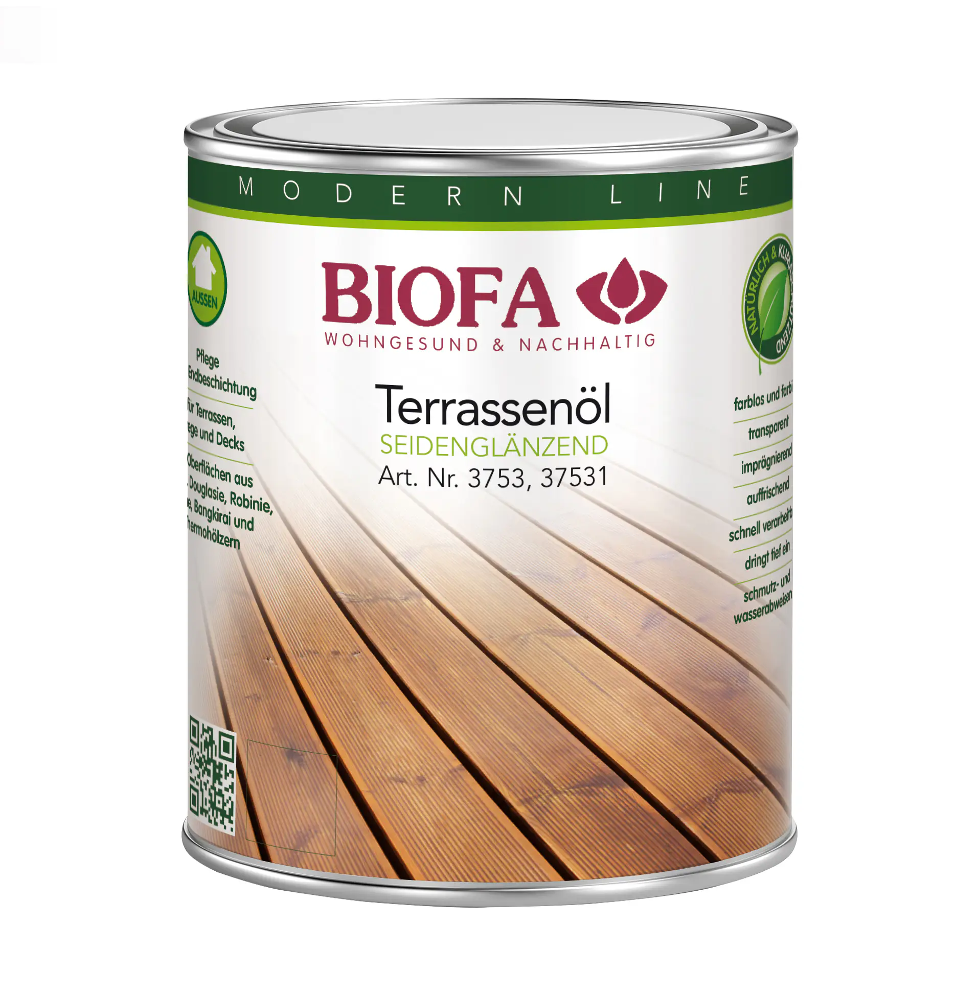Olej do tarasów BIOFA jest najwyższej jakości mieszanką olejów i żywic roślinnych. Wcześniej zaolejowane powierzchnie można za pomocą oleju do tarasów odnowić. Olej nakłada się szybko i łatwo. Wnika głęboko w drewno i chroni je od wilgoci. Olej do tarasów Biofa może być stosowany na drewno obrabiane termicznie.